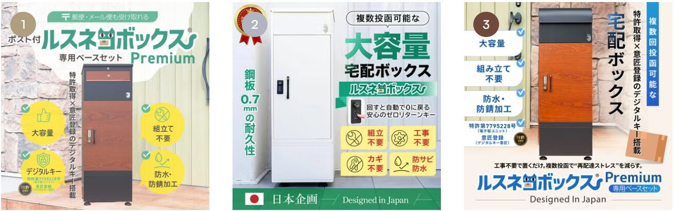 名品館はこれらを配慮した設計で、重い荷物や複数個の荷物を一度に入れやすくする内部スペースや、投函口が雨に濡れにくい位置取りになっているモデルが用意されています。