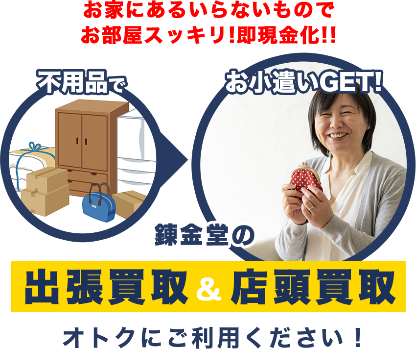 錬金堂は実店舗買取・出張買取を専門とする総合買取サービスです。ご自宅にいながら査定を受けられるため、