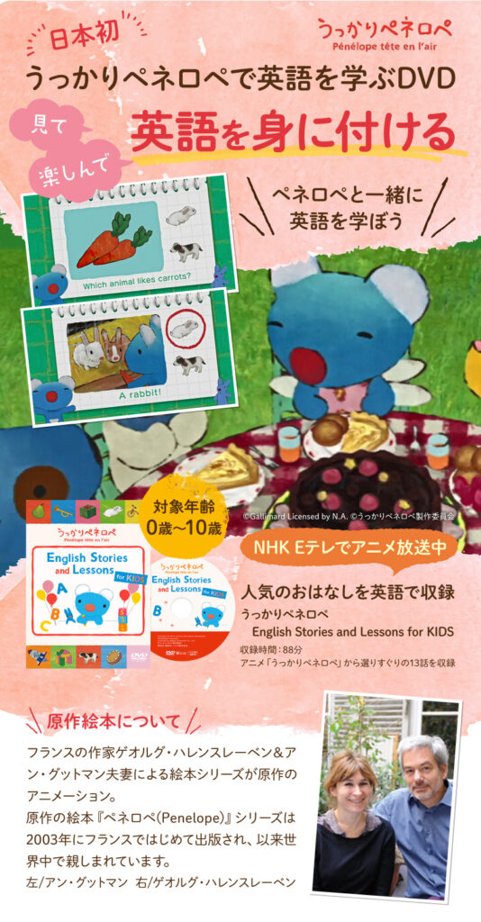 このDVDは、うっかりペネロペの英語版エピソード13話と、各話に対応した英語レッスンを収録した幼児向け英語教材です。