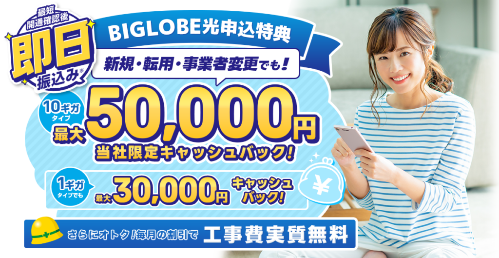 | 公式(BIGLOBE) | 10,000円〜30,000円相当 | 開通後1〜数ヶ月 | マイページ申請、継続条件あり |