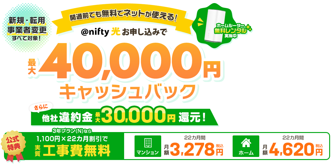 ここではnifty光の戸建て・マンション別の基本月額料金や、キャンペーン(工事費実質無料、キャッシュバック、Wi‑Fiルータープレゼントなど)を整理します。