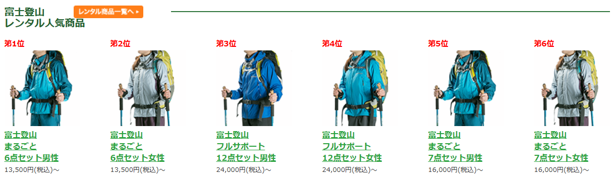 富士登山向けの人気セットは手ぶら割などの割引が適用されることがあり、基本セットに含まれるものとオプションの有無で総額が変わります。