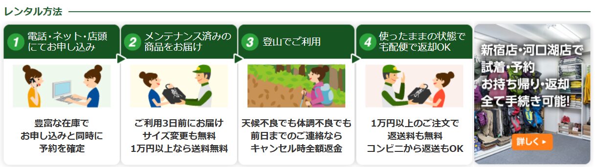 新宿店や河口湖店では事前予約により在庫確保がしやすく、五合目受取や帰りの店舗返却も選べるため、移動や宿泊計画に合わせた柔軟な利用が可能です。