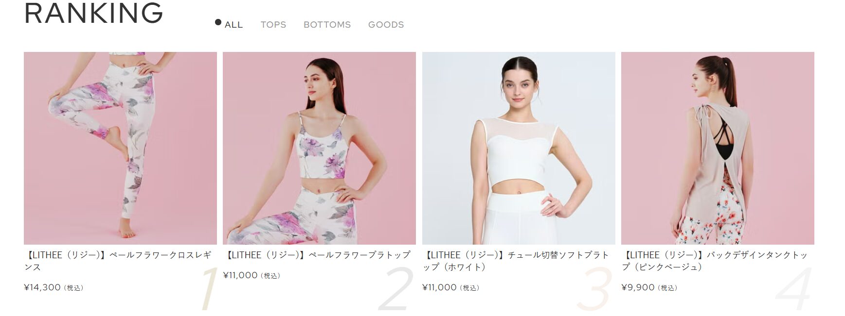 オンラインストアではレギンス、ブラトップ、チュールアイテムなど幅広いラインナップが揃い、ヨガやピラティスなどのアクティブシーンに対応した素材設計が魅力です。